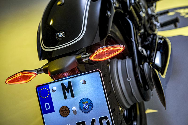 No se ven los cables, ocultos dentro del manillar. Y los tubos hidráulicos y otros adminículos son desmontables fácilmente. El reloj es analógico con display digital. Las luces son tipo LED, más acordes con los tiempos que corren. Se agradecen los pequeños intermitentes, lejos ya de las “mandarinas” clásicas. Destaca el cardan a la vista, cromado, un guiño al pasado. El logo actual de BMW va incrustado en los laterales del tanque de combustible, y va sujeto con unos tornillos (storz), otra reminiscencia de antaño.