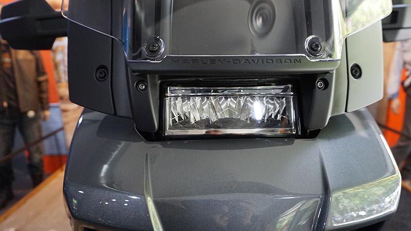 Se observan unos anclajes para incorporar baul trasero y maletas que estarán disponibles en su propio catalogo. La pantalla se puede modificar en altura, con una simple rosca manual. Los puños llevan protección antigolpes y los espejos retrovisores parecen inéditos en el resto de gama de H-D. El basculante es tipo banana.