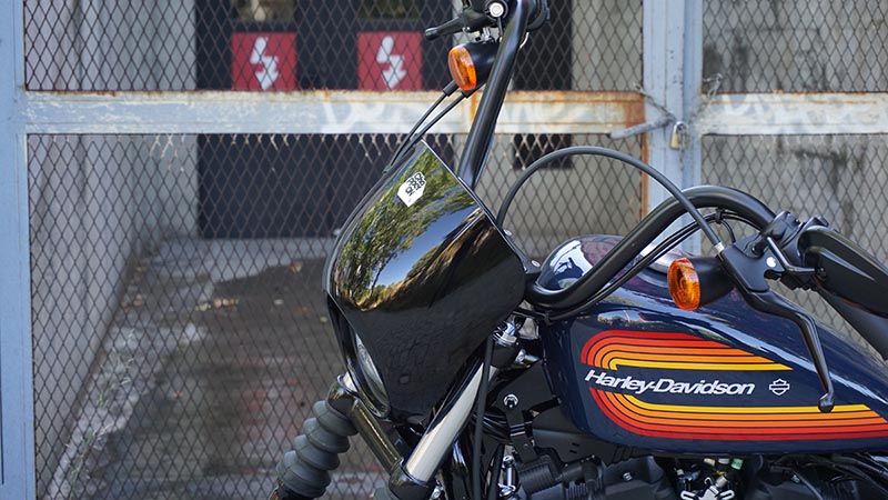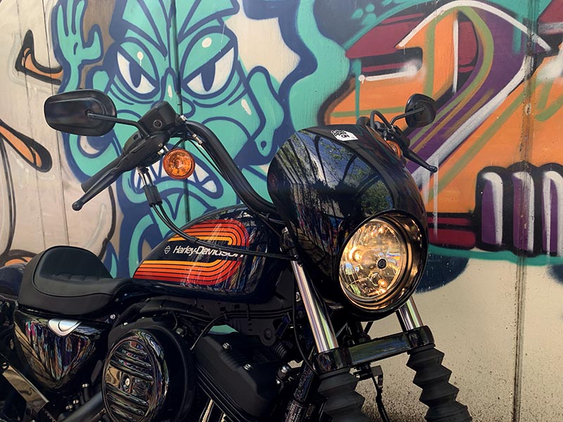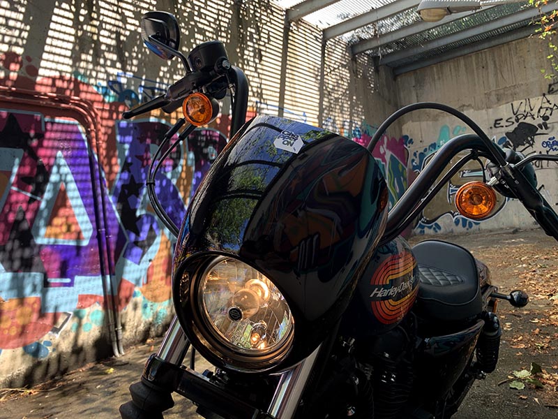 Negra, baja y recortada, así se presenta esta nueva Harley-Davidson Sportster Iron 1200, donde destaca el manillar mini cuelgamonos (apehanger) con acabado en negro satinado. La postura de conducción se adapta al manillar llevando al piloto con la espalda recta y una posición “arriba las manos”. El asiento “Café Solo” se alcanza a una altura de 735 mm desde el suelo. Delante, una cúpula rodea al faro y mejora la protección al viento. No es fácilmente desmontable y le da personalidad propia.