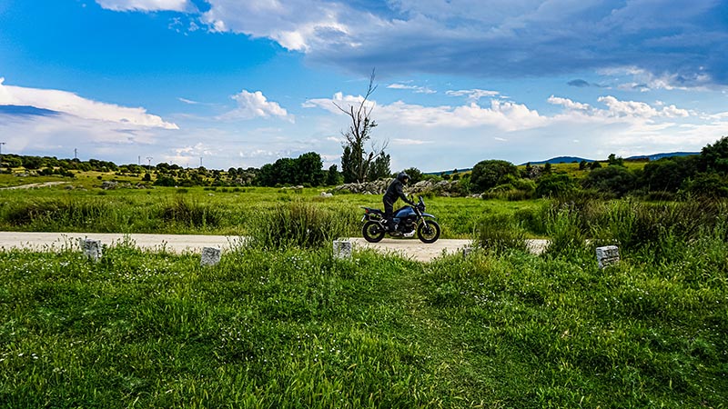 Buenas curvas de montaña y mal asfalto es su ámbito preferido. Callejear no se le da mal. Por la altura del manillar sobre los espejos de los coches, las maniobras en parado es mejor hacerlas “pie a tierra”, usando tu peso para girarla, con la pata de cabra deslizándose por el duro suelo. En carreteras secundarias se mueve con soltura, aunque la respuesta del puño no es inmediata. Gira muy bien en curvas lentas y frena como una R1 al llegar a rotondas o stops. La autopista no es lo más divertido para nadie. Ahí la V85 TT es firme, no se bambolea, pero el aire te va directamente a la cabeza, estando protegido tu torso e incluso las rodillas por el generoso tanque de combustible y los cilindros. Dan algo de calor, que en días fresquitos se agradece.