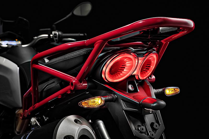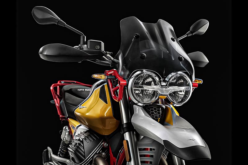 El doble faro es todo personalidad. La luz diurna de LED del faro delantero simula el perfil del águila de Mandello del Lario y atraviesa las ópticas grandes.