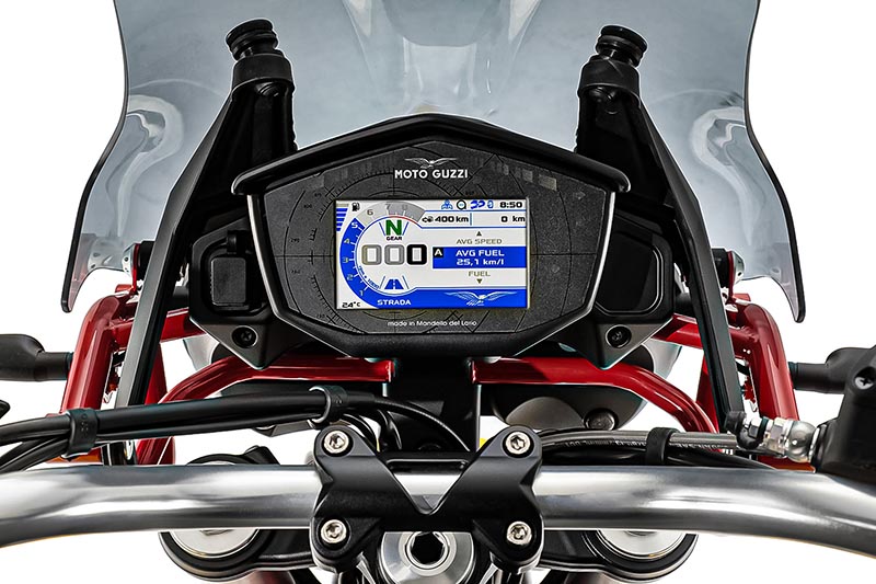 La pantalla TFT proporciona la información necesaria; además dispone de tres modos de conducción (calle, lluvia, off road). Es fácil de manejar. Los consumos de combustible, rango de autonomía y más datos útiles se pueden consultar en la pequeña pero efectiva pantalla, que cambia de fondo automáticamente según la luz ambiente (noche, túnel…). Otras funciones electrónicas de serie: control de crucero, MGCT Moto Guzzi Control de Tracción, acelerador electrónico con cableado CAN Bus entre los mandos y la centralita Magneti Marelli 7SM2: