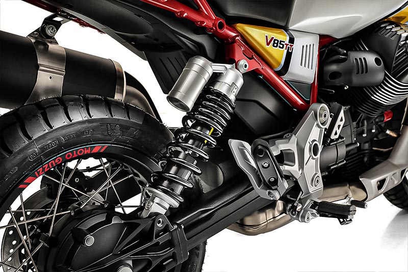 La V85 TT goza de unas curiosas proporciones: El basculante de aluminio asimétrico tiene un brazo curvo en el lado izquierdo, para favorecer la ubicación del tubo de escape, con el fin de reducir al máximo las dimensiones laterales. El brazo derecho del basculante aloja la transmisión secundaria: el cardán.