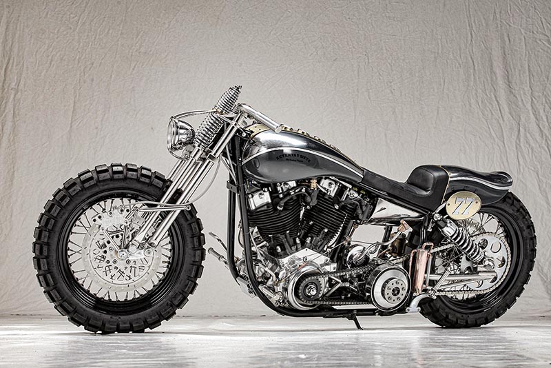 La base de la Setenta y Siete es una Harley Davidson FLH de 1977. Su propulsor es un Shovelhead de 1200cc reconstruido en las instalaciones de OCF.