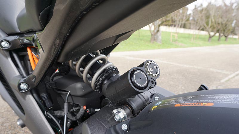 Las suspensiones Showa (delante y detrás) se encargan de sujetar esa potencia al asfalto. Ésta es suministrada por un sistema de baterías de ión-litio de 15,5 kWh de capacidad. Las baterías de la Harley-Davidson LiveWire están fabricadas por Samsung.
