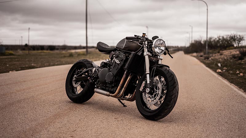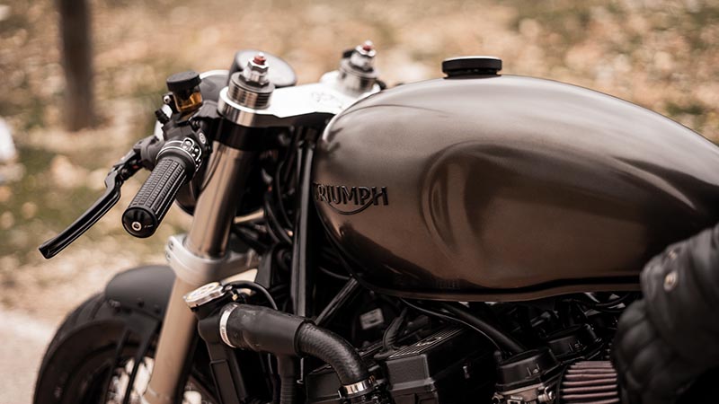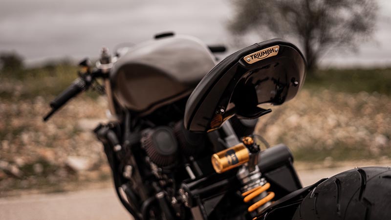 Una Triumph Trophy 1200 de 1998 es el origen de esta belleza. Te deja pasmado que esa sea su base, inédita y poco usual. El resultado final es una cafe racer feroz. Sus líneas son ligeras y distinguidas. Se desmontó su aparatosa apariencia original, de moto rutera, carenada. Su chasis fue recortado y las entrañas fueron elegantemente concebidas. Los componentes eléctricos se han simplificado y un tanque Triumph Bonneville Bobber ha sido modificado y aloja una batería de litio. El motor es un 4 cilindros en línea. Discreto y funcional.