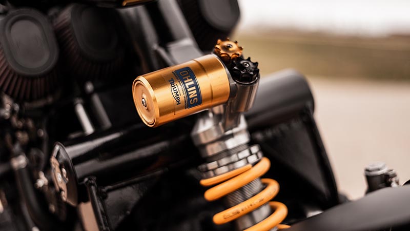 La pintura del tanque es de un pigmento sobrio, bien elegido. Un acierto sobre la penumbra de su aspecto, donde sobresale por su tono el amarillo muelle del Öhlins y el dorado del ajuste de rebote y compresión.