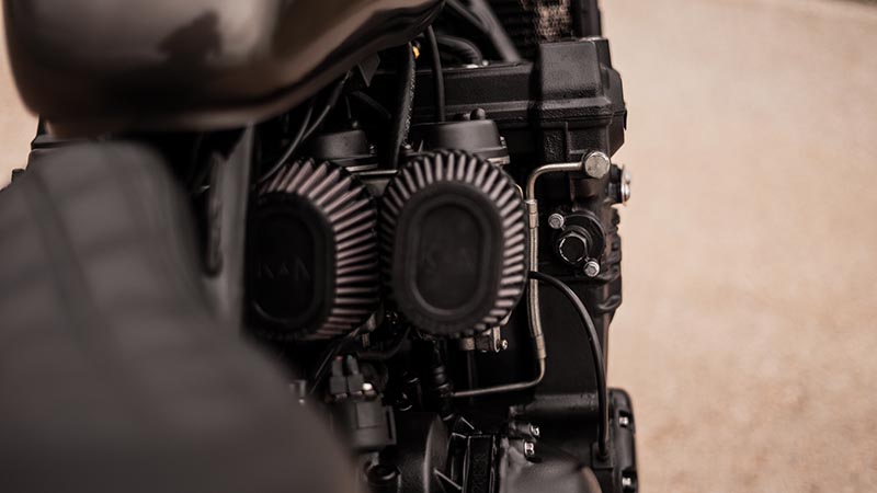 La iluminación frontal proviene de una Triumph Bonneville T120. El guardabarros delantero lo firma Rizoma y cubre una rueda de clásicas de Triumph Thruxton, de llanta radiada de 3.5″x 17 y un neumático de 140 mm. Para frenar este conjunto incorpora un eficiente doble disco Brembo radial. La rueda trasera lleva llanta 5″x 17, con una goma de tamaño 200 mm, del mismo modelo que su pareja. Un disco Brembo sujeta detrás.